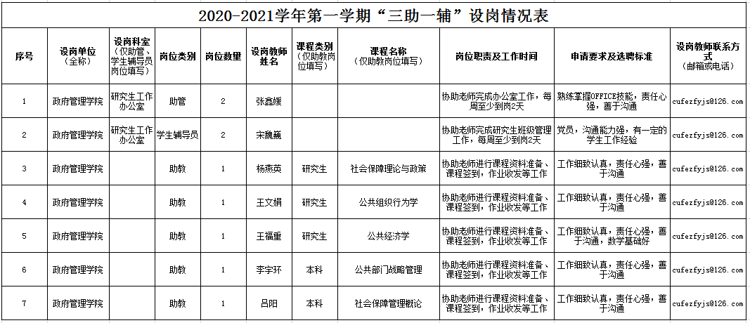 2020-2021学年第一学期“三助一辅”设岗情况表