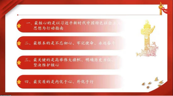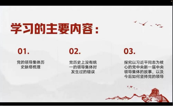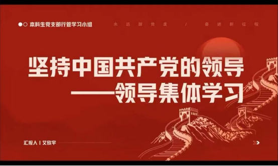 接下来,是由艾欣宇学姐关于党的全面领导的主题宣讲。她主要从三个方面进行介绍:首先是党的领导集体历史脉络梳理,讲述了毛泽东、邓小平、江泽民、胡锦涛一代领导集体的形成过程及历史贡献。第二部分,艾欣宇学姐讲述了历史上没有统一的领导集体时发生过的错误,并得出“中国共产党的领导是无产阶级的救国之路”这一结论。最后,她带领学员们共同探究以习近平同志为核心的党中央新一届中央领导集体的故事,以及今后如何坚持党的领导。坚持党的领导是党的事业成功的重要保证,是经过长期实践得出的宝贵历史经验,是中国式现代化的本质要求,必须倍加珍惜、长期坚持,并在实践中不断发展。
