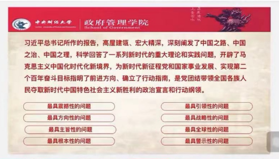 宣讲会最后,张力越同学以习近平总书记在2023年新年贺词中提到的“年轻充满朝气,青春孕育希望”为结语,希望团校学员秉持“正气浩然,上善若水”的政管精神,在党的二十大精神的感召下敢想敢试,善作善成,开启接续奋斗的新篇章。